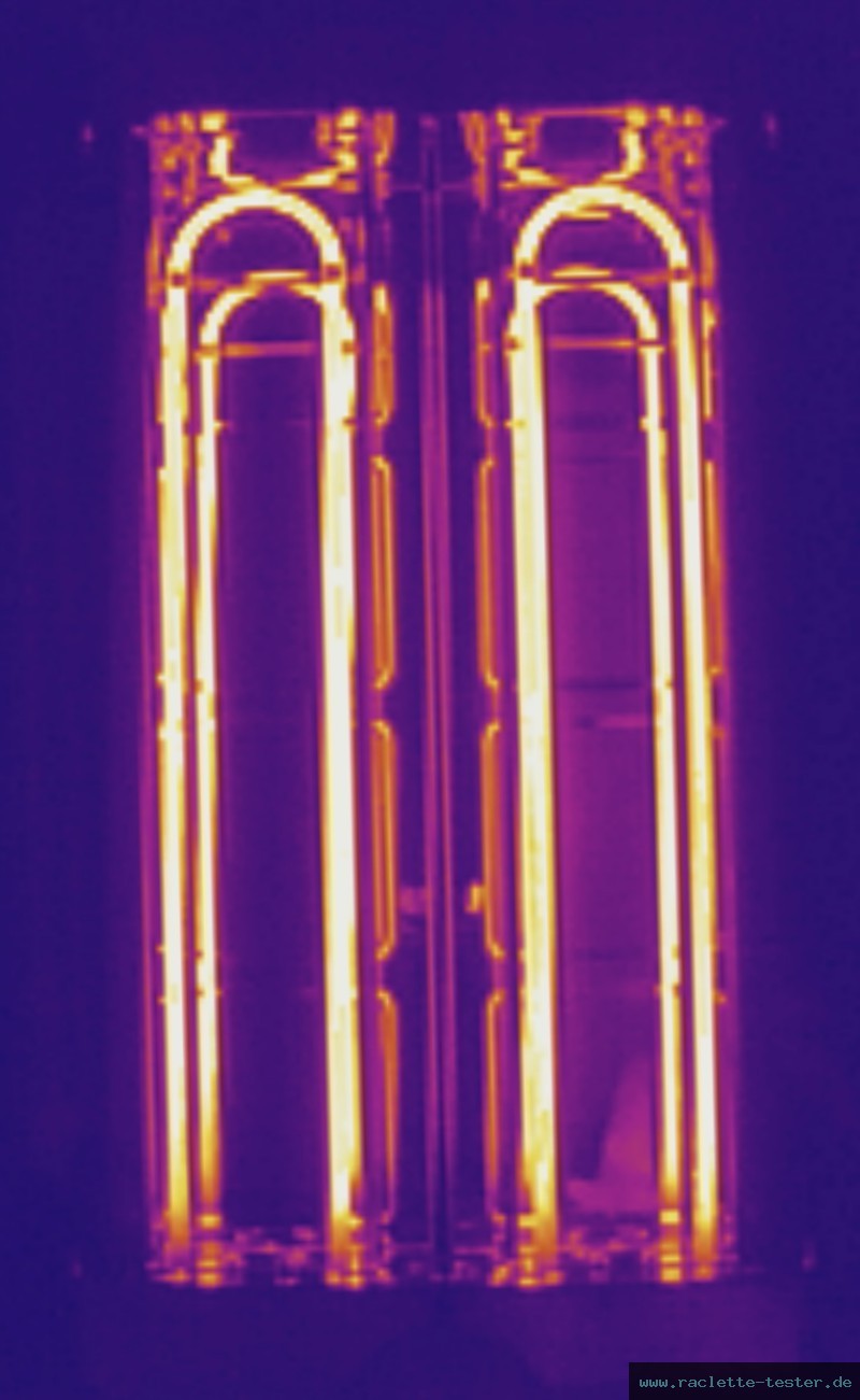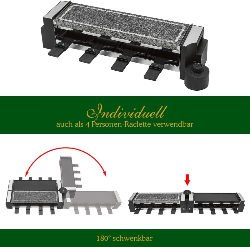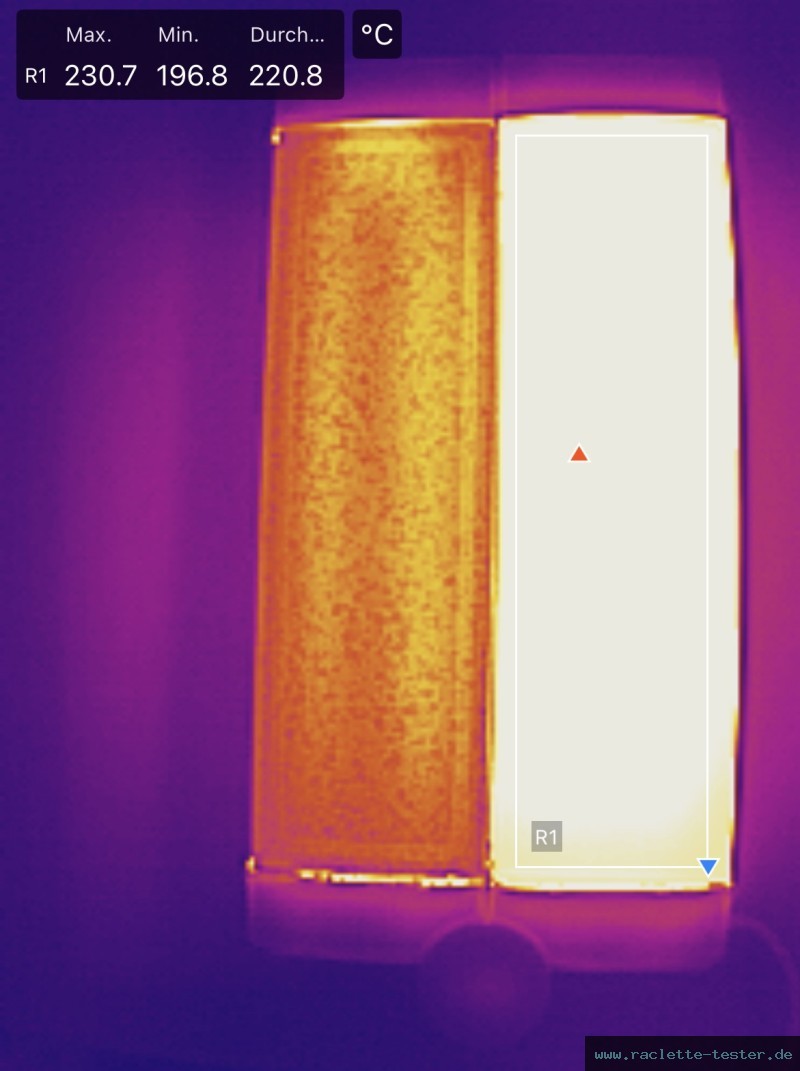Mit einer Leistung von 1200 Watt gehört das Raclette Grill zu den leistungsstarken Raclette-Geräten. Die Aufheizzeit auf 180°C beträgt ca. 320 Sekunden (5,33 Minuten), bis die Grillplatte heiß genug ist und der Käse in den Pfännchen zu schmelzen beginnt. Im Vergleich zu anderen Modellen ist das Gerät eher langsamer einsatzbereit.