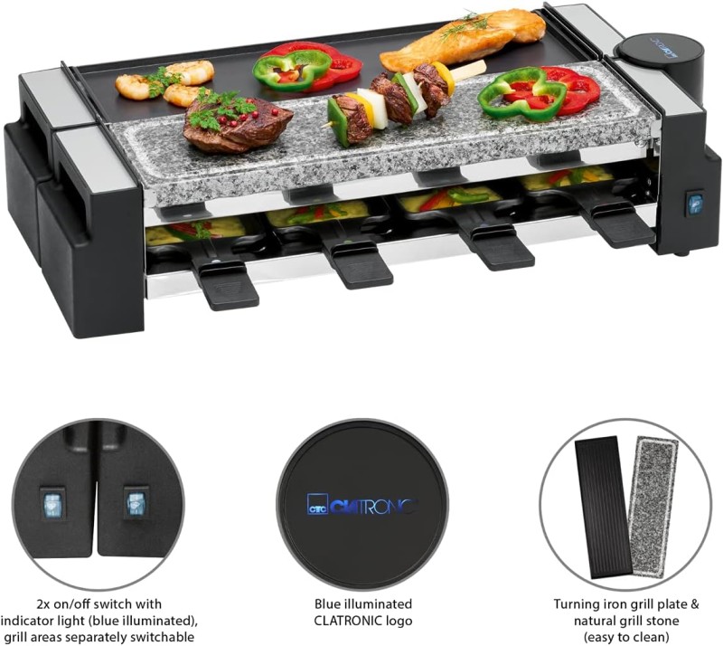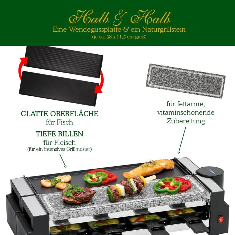 Das Raclette Grill von der Firma Clatronic ist ein Grill mit einer Leistung von 1200 Watt und ist mit 8 Pfännchen ausgestattet, was ideal für ca. 8-10 Personen ist. Die Grillfläche misst 2 x 37 x 11 cm und bietet ausreichend Platz für Raclette-Gerichte. Wie schlägt sich der Raclettgrill nun in der Praxis? In unserem Test haben wir das Gerät hinsichtlich Aufheizzeit, Materialqualität, Reinigung, Temperaturregelung und besonderen Features genau unter die Lupe genommen.