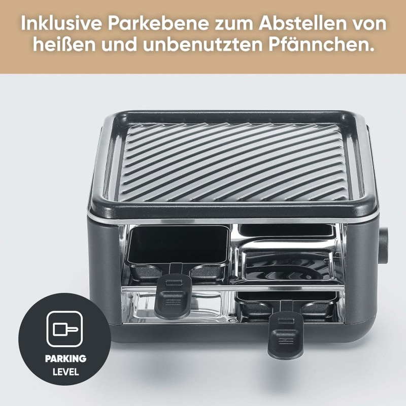Die Länge des Kabels beträgt bei diesem Gerät 1,60 m. Wenn das Kabel zu kurz ist, muss man einen Zwischenstecker verwenden, welcher bei billiger Ausführung und hoher Wattzahl beschädigt werden kann. Tragegriffe verhindern, dass man das Gerät an Stellen angreift, die heiß oder scharf sein können. Das Black Line Lite Mini Raclette-Grill besitzt leider keine eigenen Griffe zum Tragen. Ein Regler zur Steuerung der Temperatur (sog. regelbarer Thermostat) ist bei diesem Gerät vorhanden. Das Gerät verfügt über einen Pfannenparker. Bei einem Pfannenparker hat die Ablagefläche der Pfannen eine kleine Vertiefung, sodass die Pfannen nicht verrutschen können.