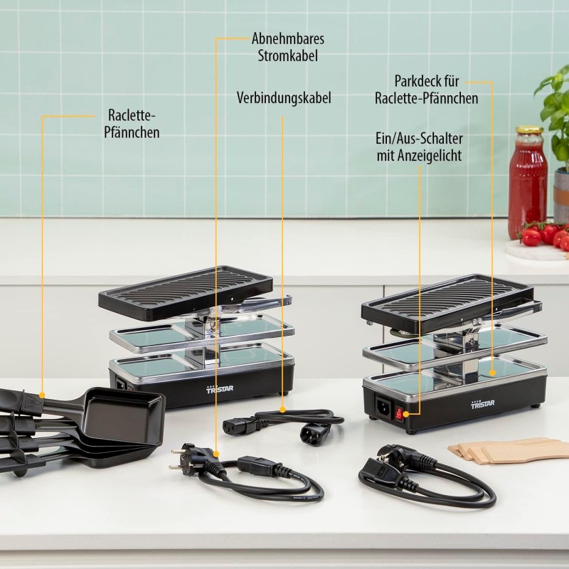 Mit einem Preis von ca. 35 Euro bewegt sich das Koppelbares Raclette von Tristar in der Einsteiger-Kategorie.
