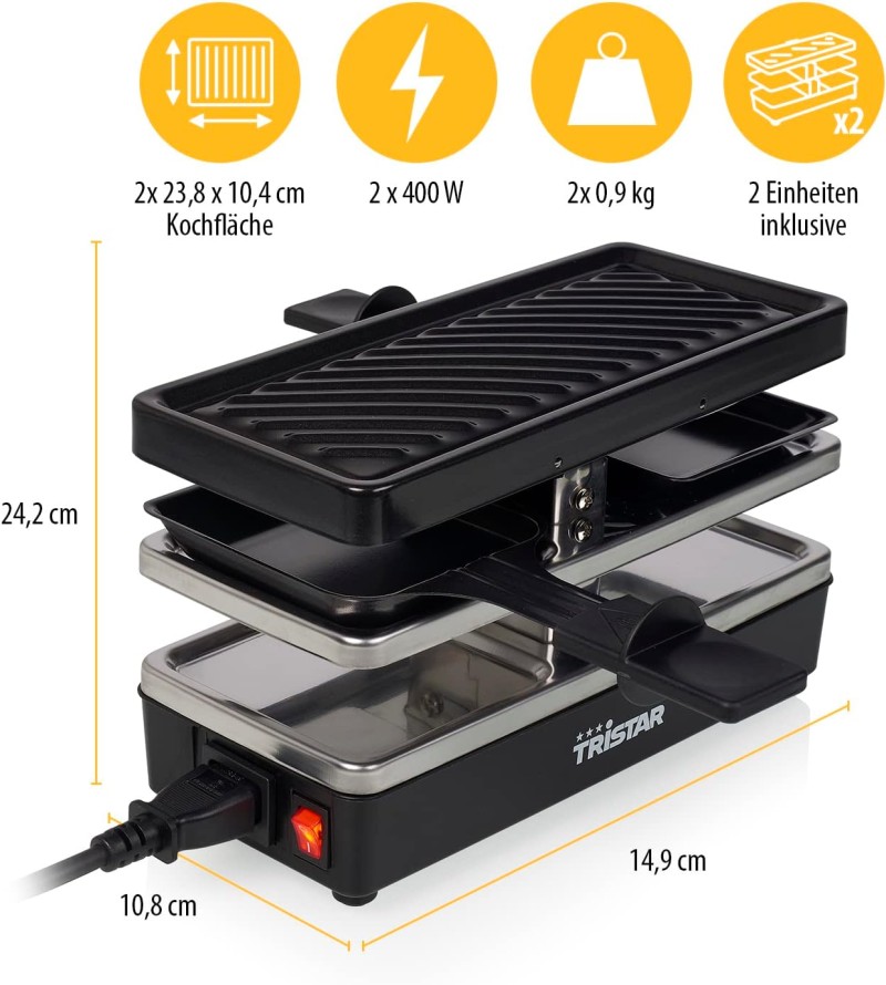 Das Koppelbares Raclette von der Firma Tristar ist ein Grill mit einer Leistung von 400 Watt und ist mit 4 Pfännchen ausgestattet, was ideal für ca. 3-4 Personen ist. Die Grillfläche misst 23,8 x 10,4 cm und bietet ausreichend Platz für Raclette-Gerichte. Wie schlägt sich der Raclettgrill nun in der Praxis? In unserem Test haben wir das Gerät hinsichtlich Aufheizzeit, Materialqualität, Reinigung, Temperaturregelung und besonderen Features genau unter die Lupe genommen.