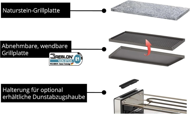 Vorteilhaft ist, dass durch die Antihaftbeschichtung kaum Rückstände haften bleiben und die Platte und Pfännchen einfach abgewaschen werden können.